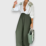 A Nivana szett elegáns blúzt kombinál finom virágmintákkal és laza, széles szárú nadrágokkal – ideális stílusos napokra. A könnyű anyag és a magas gallér nőies és kifinomult megjelenést kölcsönöz az egésznek.
