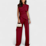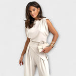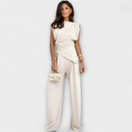 Szoborszerű elegancia modern árnyalattal: A Szofia szett aszimmetrikus felsőt kombinál széles nadrágokkal, amelyek stílusosak és elegánsan omlanak. Ideális különleges alkalmakra vagy a mindennapi megjelenés könnyed felfrissítésére.