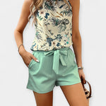 Frissítse fel ruhatárát ezzel a fényes és friss szettel, amely ideális a meleg tavaszi és nyári napokra. A nyakpántos top modern szabása kiemeli a vállakat, míg a hozzá illő övvel ellátott rövidnadrág stílust és kényelmet ad a mindennapi kirándulásaihoz.