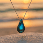 • Labradorite naturale: venature uniche e sfumature blu-verdi che cambiano alla luce e riflettono la profondità del mare.