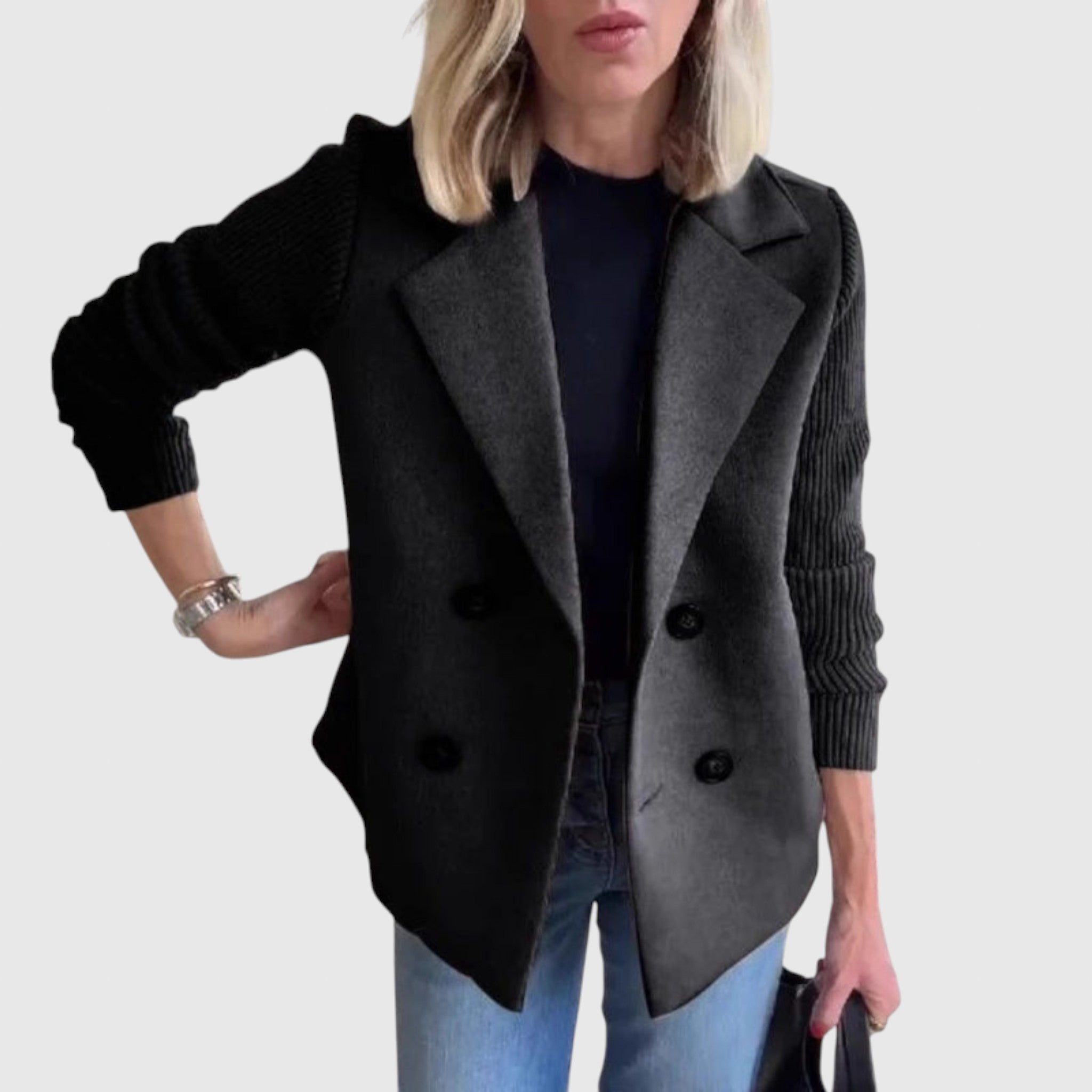 Univerzális blézer, amely ötvözi a strukturált szabás kifinomultságát a kötött anyag lágyaságával.