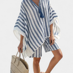 Tengeri frissesség laza bájjal. A Nancy szett egy oversized csíkos ingből áll sötétkék és fehér színben, elegáns sorttal kombinálva, amely nyári és gondtalan megjelenést kölcsönöz. Olyan részletek, mint a dekoratív frufruval díszített V-nyak és textil befejezés karaktert és könnyedséget adnak.