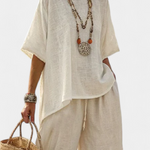 Tiszta egyszerűség természetes eleganciával. A Daisy szett laza és monokróm sziluettjével tűnik ki, ideális azok számára, akik kényelmet és tiszta stílust keresnek. Könnyű anyagból készült, ez a megjelenés minden mozdulatot frissességgel és elegáns lazasággal kísér.