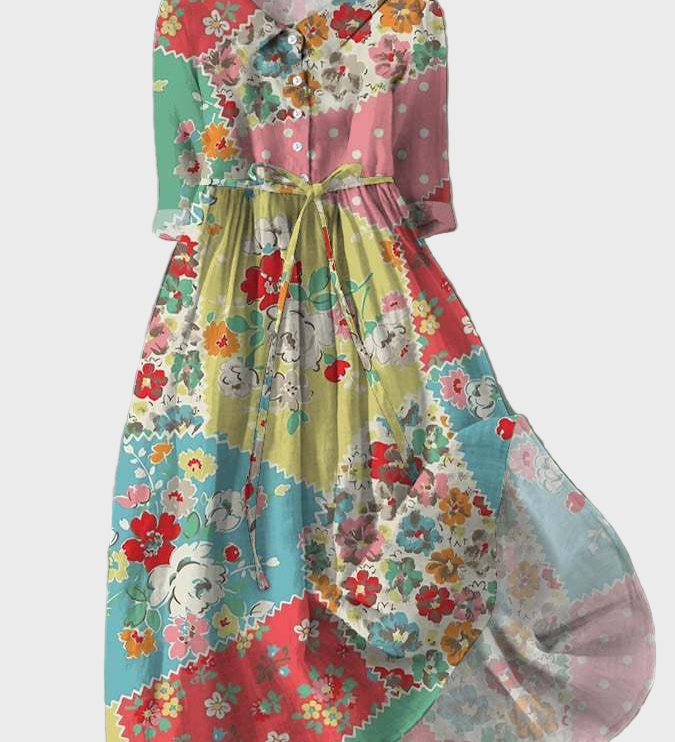 Pöttyös patchwork stílusú ruha színes mintával