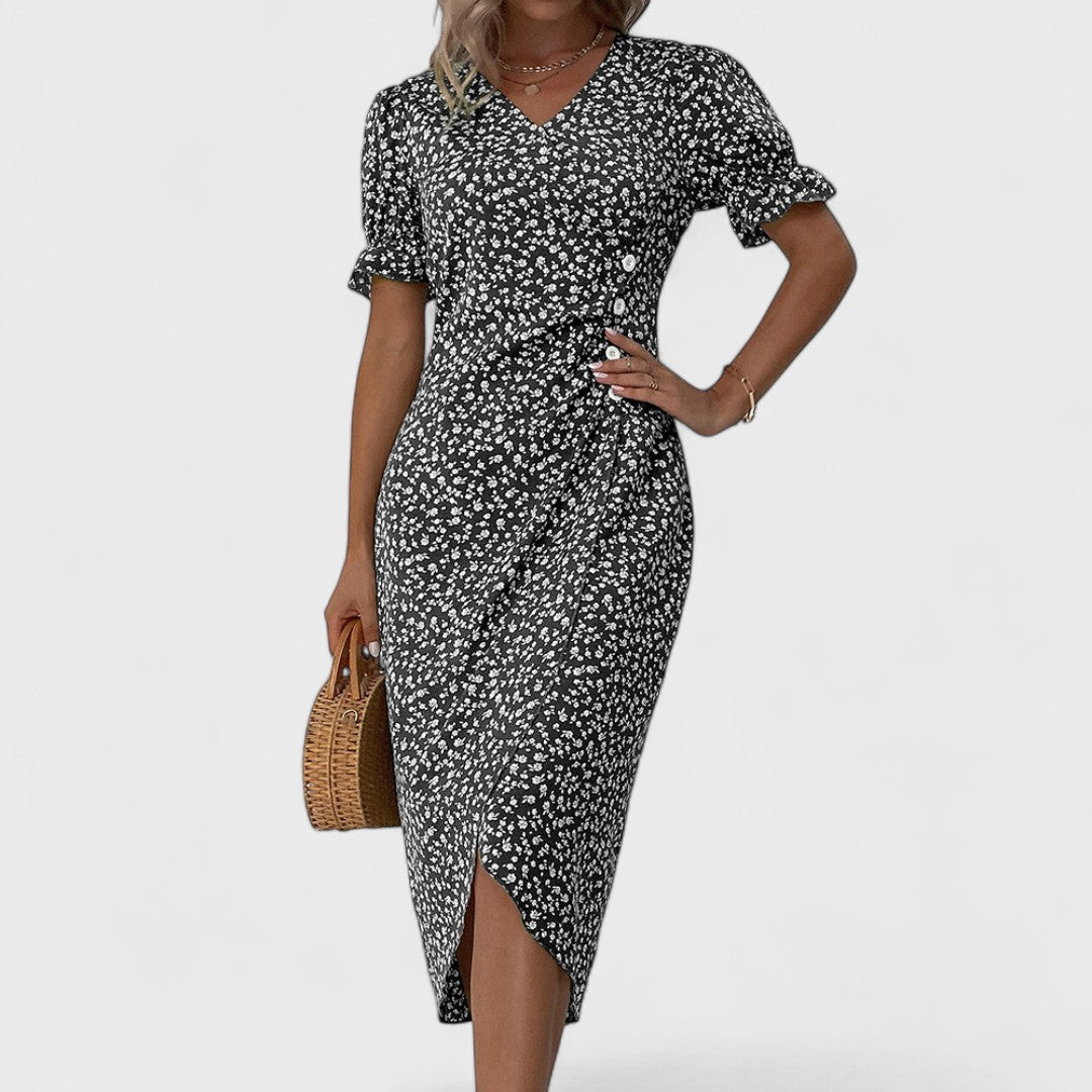 Az Irena ruha a finom virágos mintát ötvözi a kifinomult szabással, amely gyengéden eltakarja a hasat, és kényelmet, valamint magabiztosságot biztosít a viselőjének. A könnyű anyag szépen omlik, míg az örök szabás és a diszkrét részletek kiemelik a természetes bájt minden lépésnél. Ideális választás a stílussal és kényelemmel teli nyári napokra.