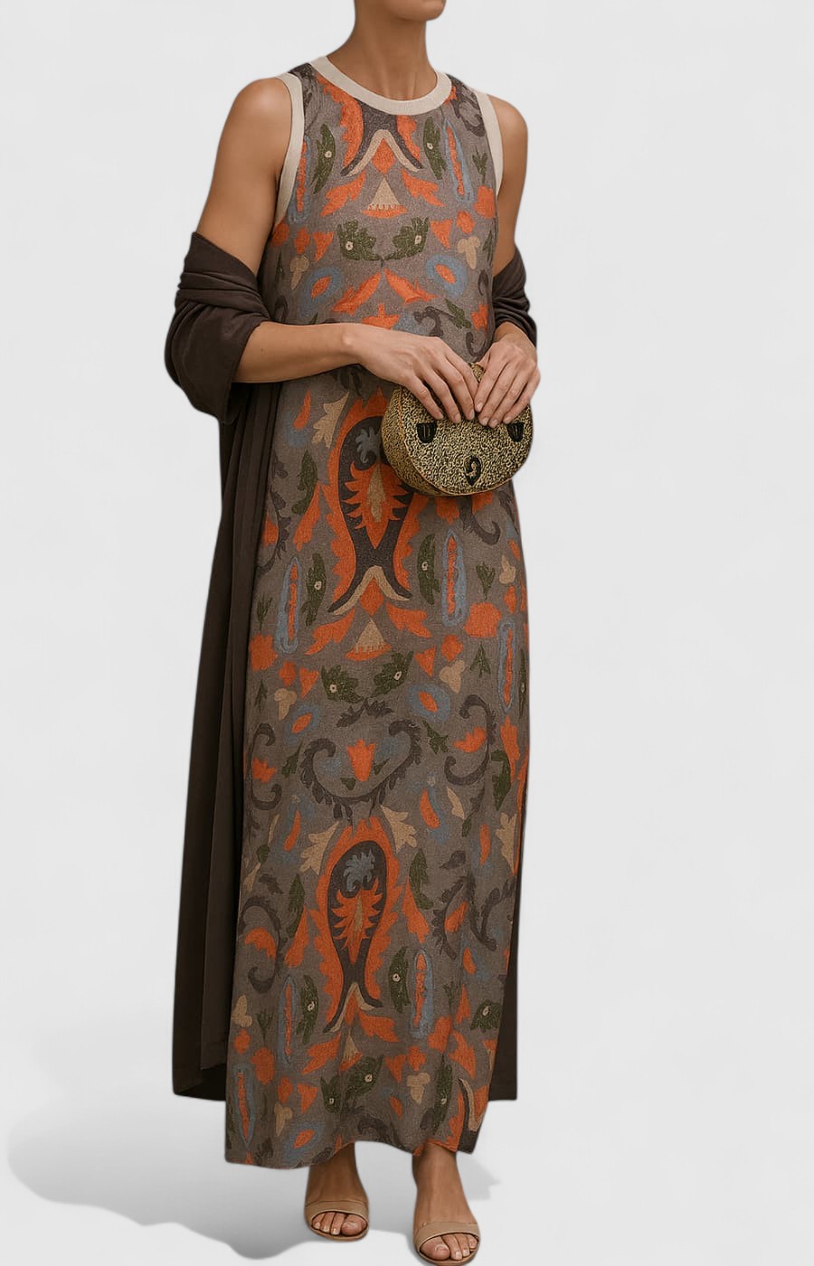 Ez a szett tartalmaz egy elegáns hosszú ruhát és egy koordinált sálat, amelyek tökéletesen kiegészítik egymást.