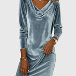 A Zsófia velúr ruha a mindennapi kényelem és a kifinomult stílus tökéletes egyensúlyát kínálja. A puha, drapált gallér és a laza, nőies sziluett könnyed eleganciát sugároz, miközben egész napos komfortot biztosít. A finom kék velúr anyag lágy esése időtlen megjelenést teremt, amely ideális otthoni pillanatokhoz és városi programokhoz egyaránt.